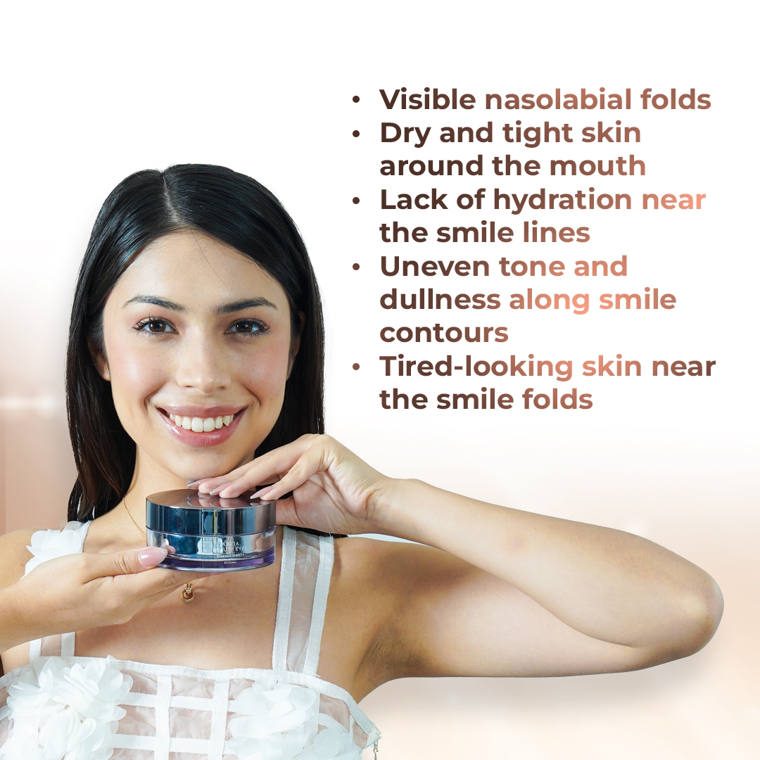 • Moisturizing & Brightening – Hydrates the skin around the smile line and reduces dullness and dark circles caused by dryness.