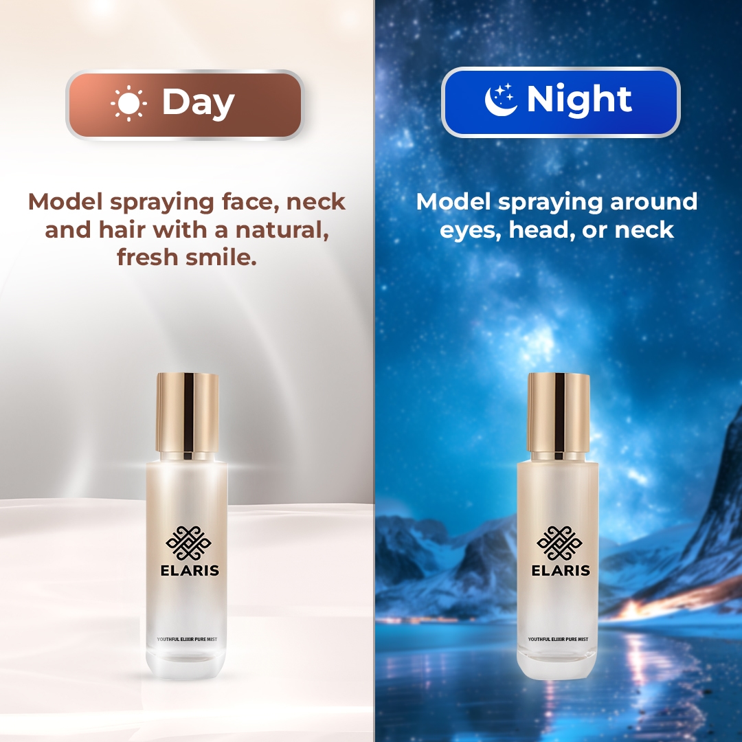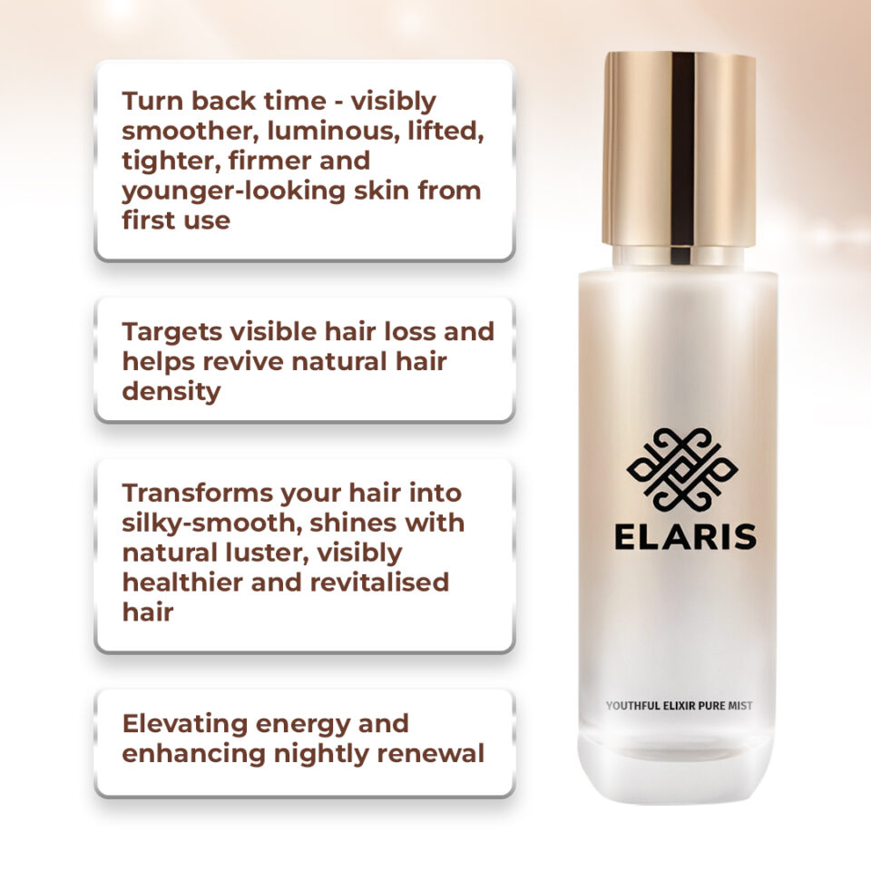 ELARIS Youthful Elixir Pure Mist is designed for use on the face (including the delicate eye area), neck, scalp and hair. To achieve optimal results, please spray ELARIS on your face and neck evenly.
