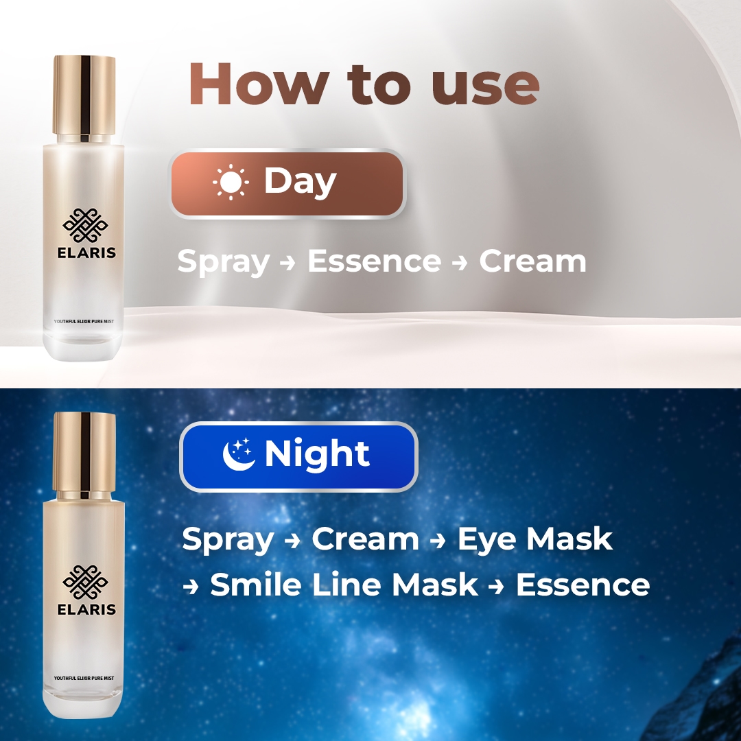 Get an instant result by combine with Elaris Youthful Elixir Pure Mist, Essence, Eye Mask and Smile Line Mask.